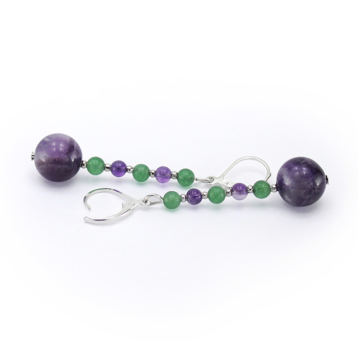 Оригинальные серьги из натурального аметиста и хризопраза "Аиша". Цветовая гамма распустившейся сирени плюс стильное, лаконичное исполнение. Диаметр бусин 12 и 4мм. Длина серьги со швензой 6 см. Вес серьги 3 гр. Фурнитура: ювелирный сплав.