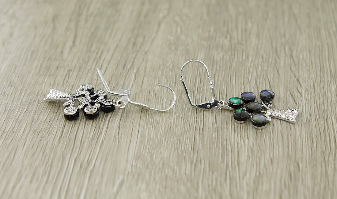 Забавные серьги с натуральным перламутром гелиотисом, в родированной оправе. Размер серьги с застежкой: 45мм.