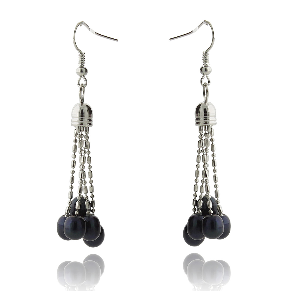 Изящные серьги с натуральным речным жемчугом черного цвета. При ходьбе жемчужинки легко покачиваются на металических цепочках. Длина сережки с крючком 6см. Диаметр жемчуга примерно 5мм.