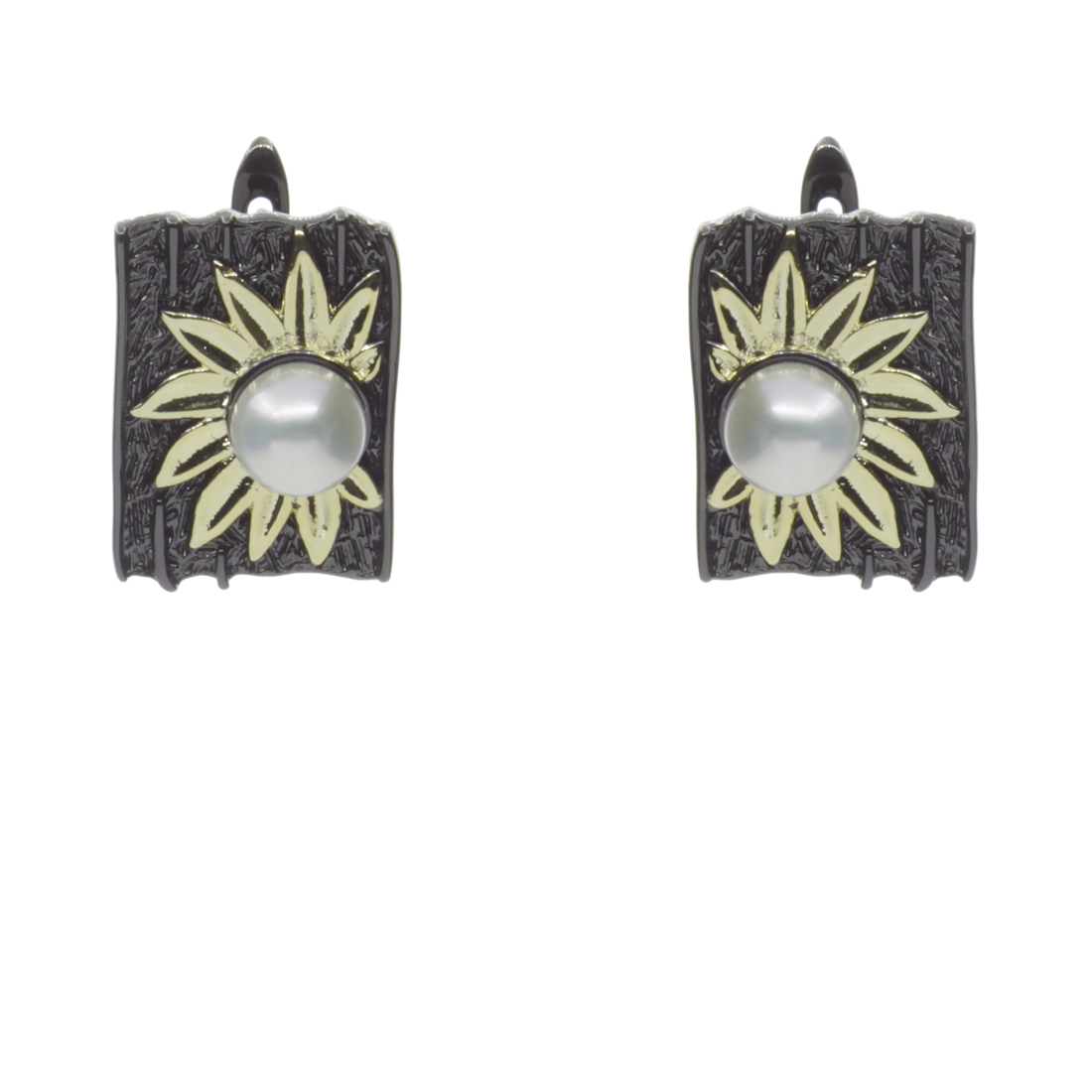 Изящные и аккуратные сережки в виде подсолнуха с белым жемчугом. Размер жемчуга 6,5мм. Размер кулона 13,5x20мм