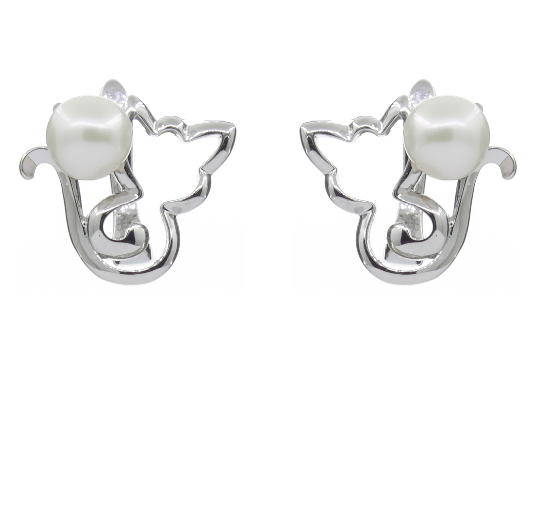 Милые и аккуратные сережки в виде кошечки с белым жемчугом. Размер жемчуга 7мм. Размер серьги 15х15