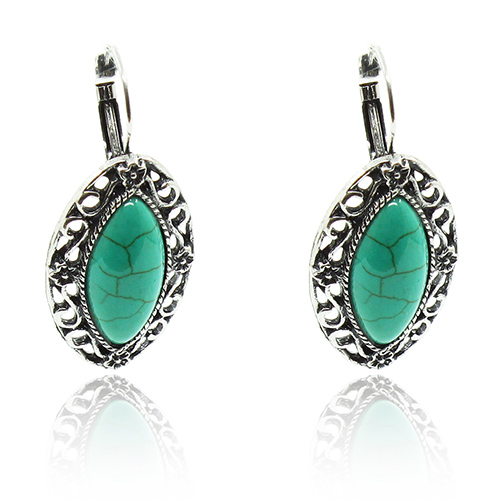 Эффектные серьги со вставками из бирюзы (имитация) в витой оправе добавят изыска Вашему образу. Длина серёжки с застёжкой: 4,5см