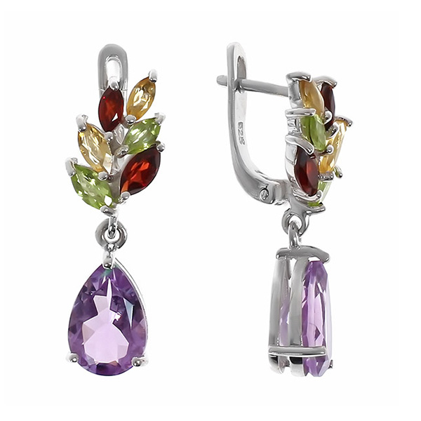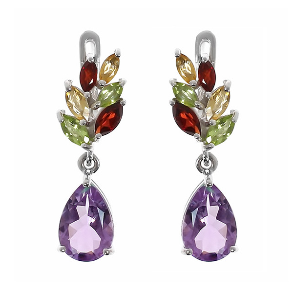 Серьги из серебра 925 пробы с аметистом природным, гранатом природным, хризолитом природным и цитрином природным, покрытие: Родий. Средний вес изделия 6,89 гр.