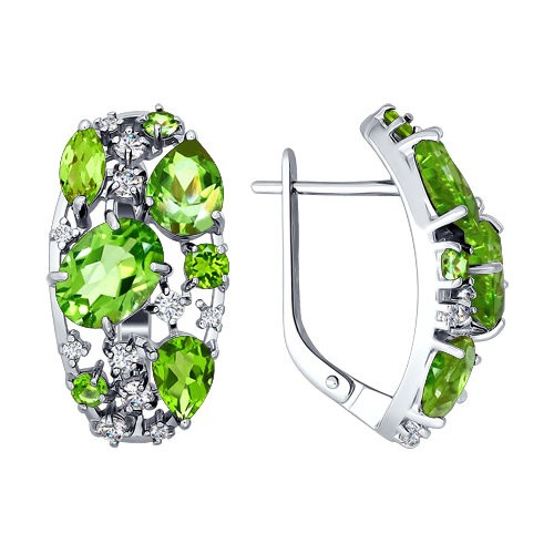 Серьги выполнены из серебра 925 пробы с родиевым покрытием. Вставки из хризолитов разных форм и мелких фианитов. Длина сережки: 2,2см. Вес: 5,46 г