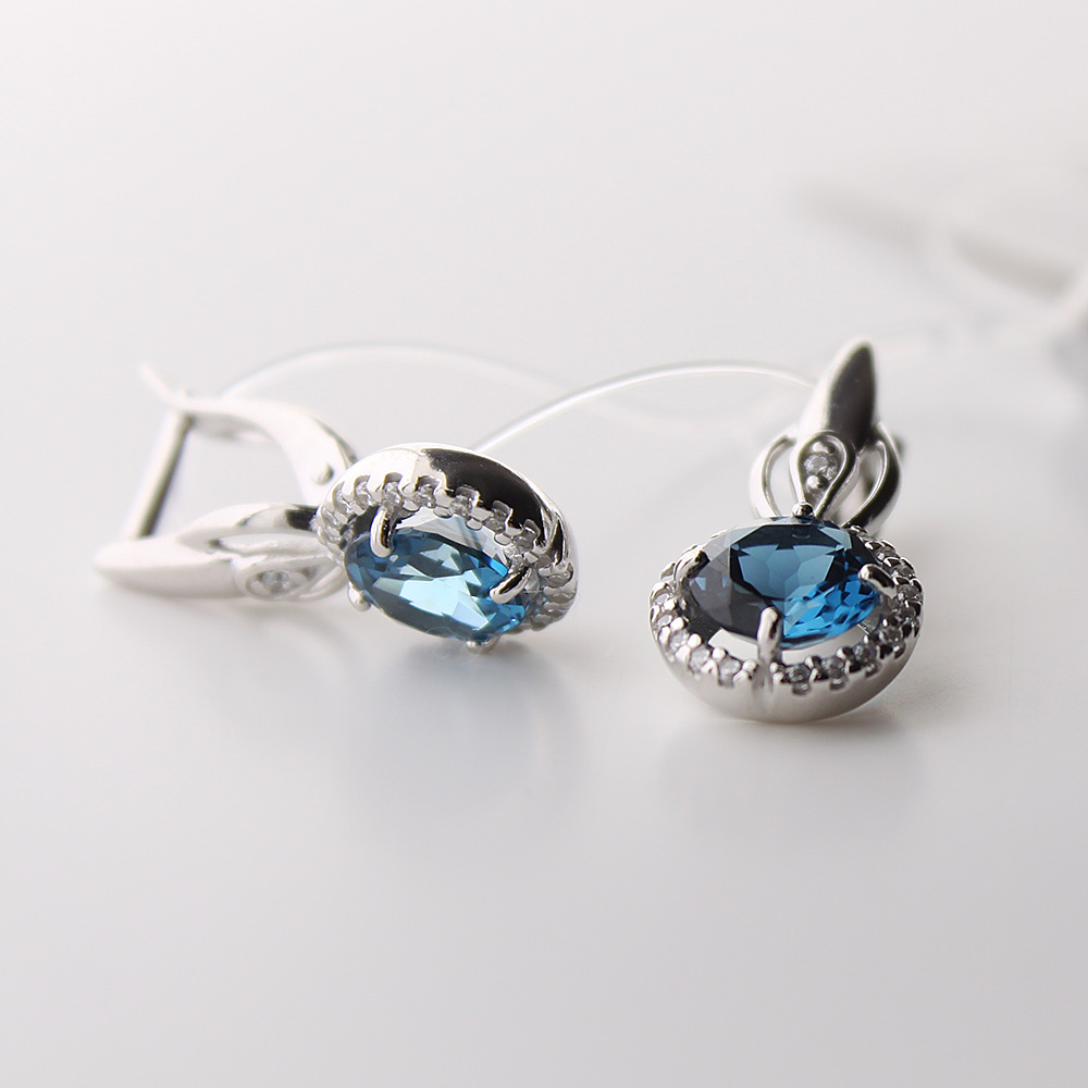Серьги из серебра 925 пробы с родиевым покрытием. Вставки из великолепных топазов Лондон насыщенного цвета в россыпи фианитов. Диаметр камня:7мм. Длина изделия: 2,3см. Вес: 3.72г.